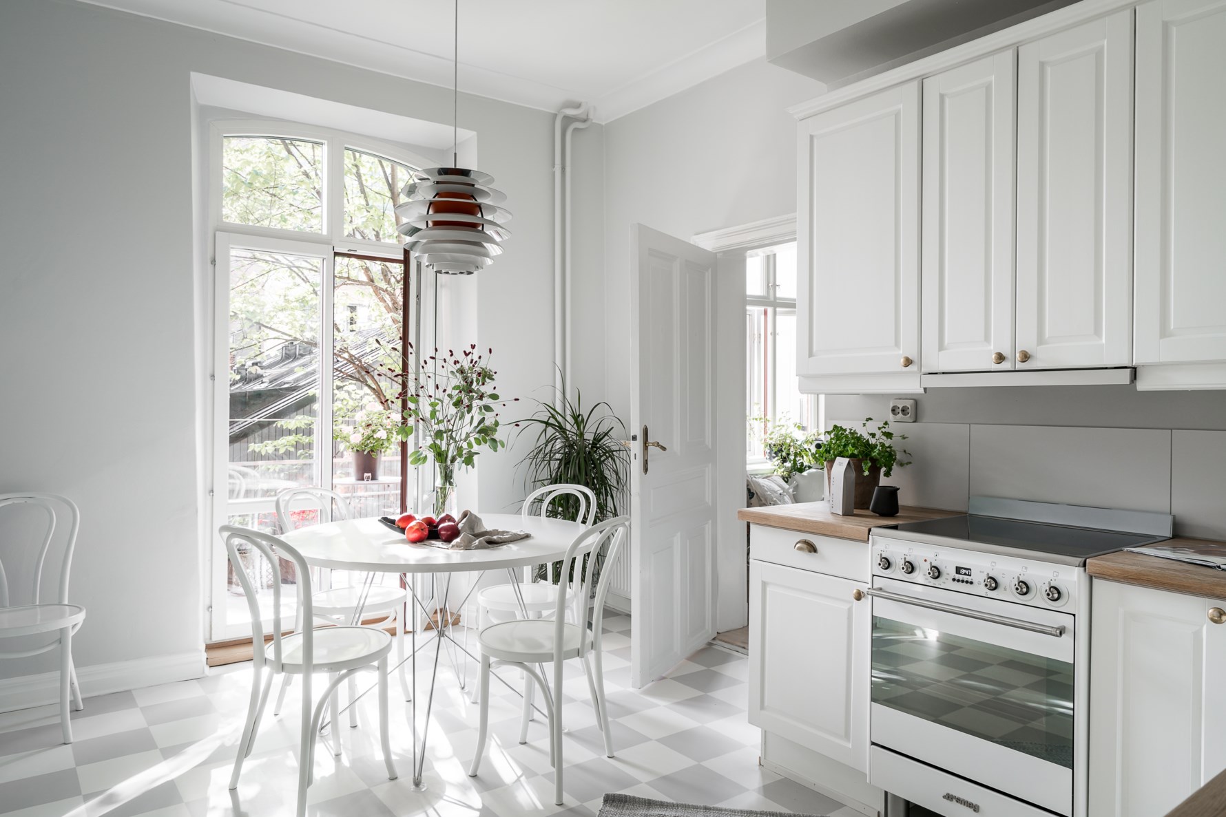 Direkt till vänster ligger köket som har fint ljusinsläpp tack vare södersolen och mysigt gårdsläge med pardörrar i glas ut till den stora härliga balkongen som har utsikt över den lugna fina innergården. Trivsamt sällskapskök som även erbjuder gott och förvaring och generösa arbetsytor. Köket har vit köksinredning i lantlig stil som kombineras med bänkytor i ek, porslinsvask och vita stora kakelplattor. Den maskinella utrustningen består av hällspis med ugn från Smeg (2021), fläkt, diskmaskin från Smeg (2021) samt kyl med frys i rostfritt. Schackrutigt golv i grått och vitt tillsammans med gråa målade väggar. I köket ryms en matplats för hela familjen och vid större middagssällskap kan man nyttja lägenhetens matsal.