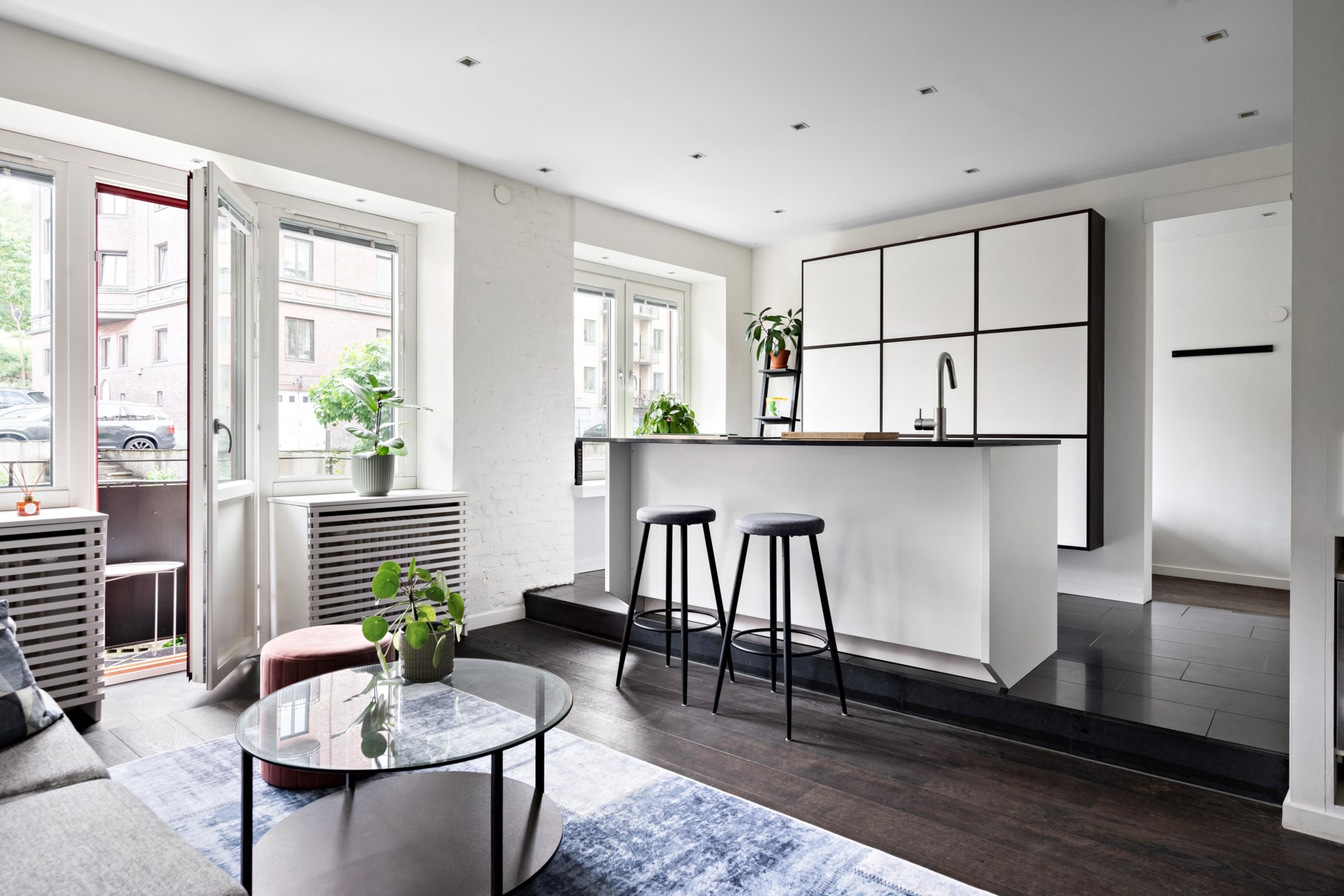 Vardagsrum och kök med öppen planlösning med anslutande matplats. I vardagsrummet ryms soffa med tillhörande möblemang och matbord för ett större sällskap vid matplatsen. Matplatsen har upphöjt kubbgolv i mörkpigmenterad ek. Resterande golv i vardagsrummet är rökbehandlad ekparkett.
