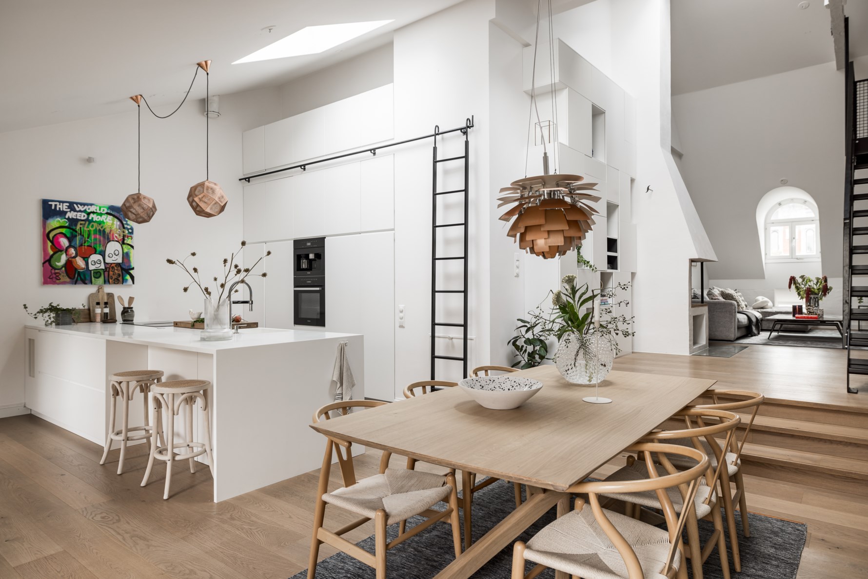 Renoverat och sällskapligt kök från 2023 i vitt utförande där varje detalj är väl genomtänkt och med köksö som skapar den perfekta platsen för vänner och familj att samlas. Den maskinella utrustningen med kvalitativa vitvaror från Miele och Smeg består av induktionshäll med integrerad fläkt, inbyggd ugn, inbyggd kaffemaskin, integrerad diskmaskin samt integrerad kyl och frys i fullhöjd. Den slående takhöjden tillsammans med takfönster och den öppna planlösningen mot matplats och vardagsrum skapar en otrolig känsla av rymd där ljusinsläppet får flöda fritt. Intill köket finns en given plats för ett större matbord och härifrån nås bostadens balkong.