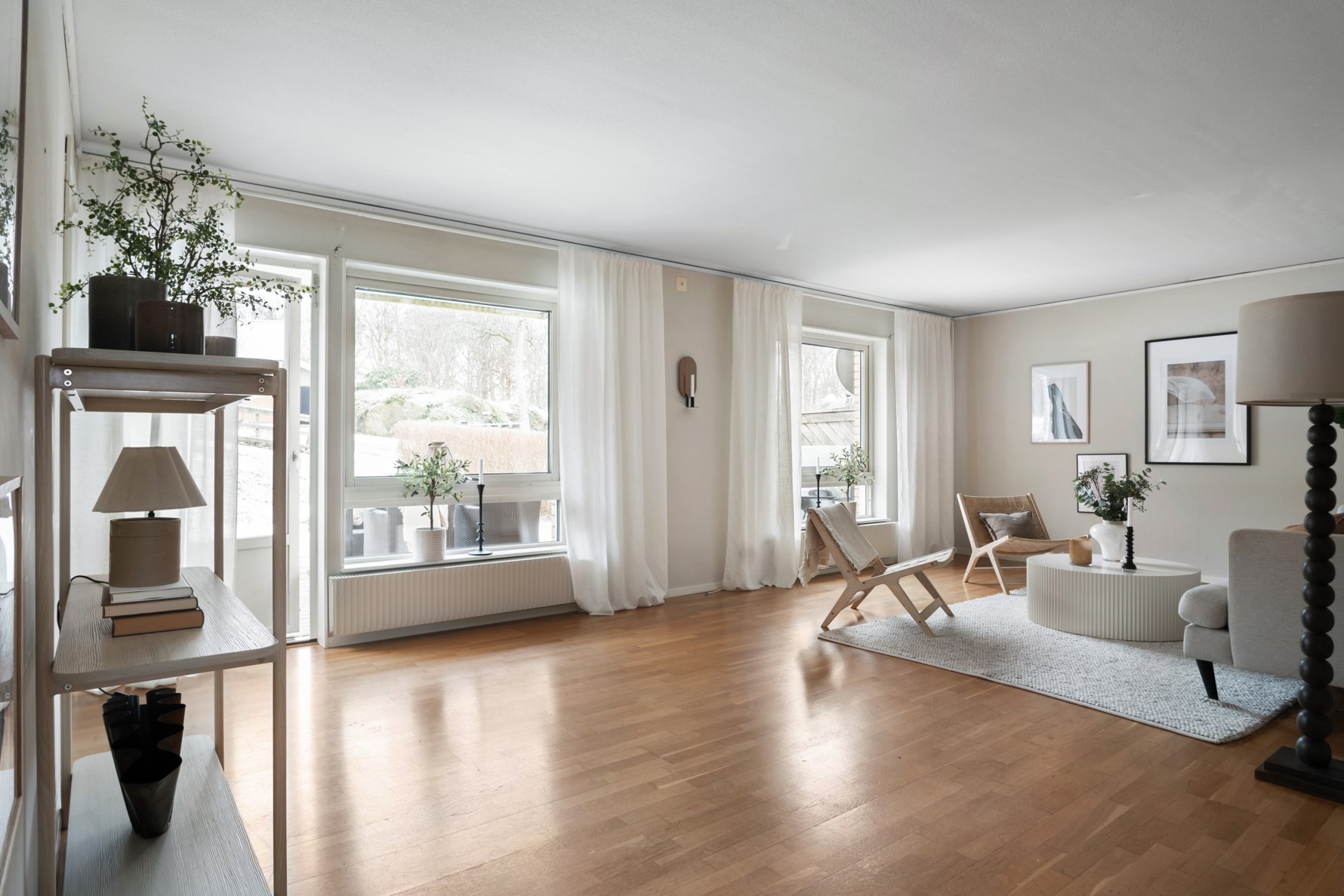 Vidare in i bostaden möts ni av det stora vardagsrummet. Bostadens hjärta och naturliga samlingsplats för hela familjen.Här har en större soffgrupp med tillhörande möblering en självklar plats, likväl som ett matsalsbord för minst 8 personer. Härifrån når man den fina uteplatsen med sol större delen av dagen som vetter mot grönområde. Här kan ni möblera med loungemöbel och grill för att kunna njuta av en god middag under sommarmånaderna med sol från förmiddag till kväll. Vardagsrummet kan delas av för ytterligare ett sovrum.