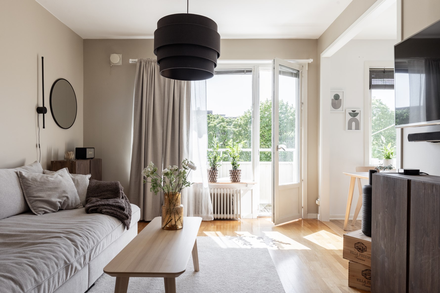 Lättmöblerat allrum med trägolv och härligt ljusinsläpp från ett generöst fönsterparti. Tack vare öppningen mellan köket och allrummet skapas en social och trevlig planlösning som är perfekt för sociala tillställningar. Från allrummet nås bostadens balkong i eftertraktat västerläge som har sol mer eller mindre hela dagen. Allrummet har en sovalkov som får en naturlig inramning eftersom den är målad i en grå brun ton till skillnad från det övriga rummet som har en sandfärgad ton.