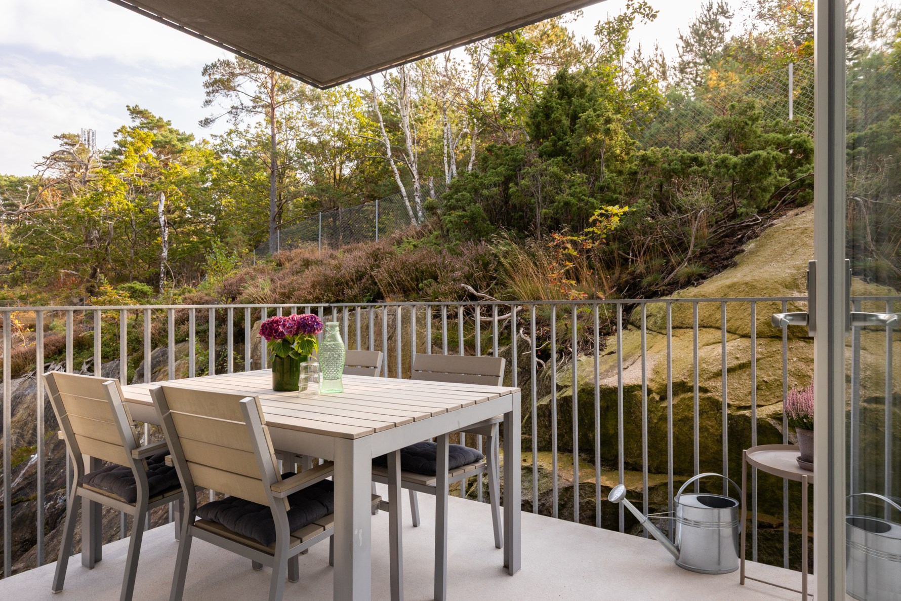 Gemensam gård mellan husen och föreningen har tillsammans med familjebostäder köpt in gårdsmöbler. Fantastisk miljö med genomtänk och mysig kvällsbelysning mot berget. Här finns både lekmöjligheter för barn och umgänge vid de olika sittplatserna på gården. Mycket färg och trevlig sammansättning av växterna i planteringarna.