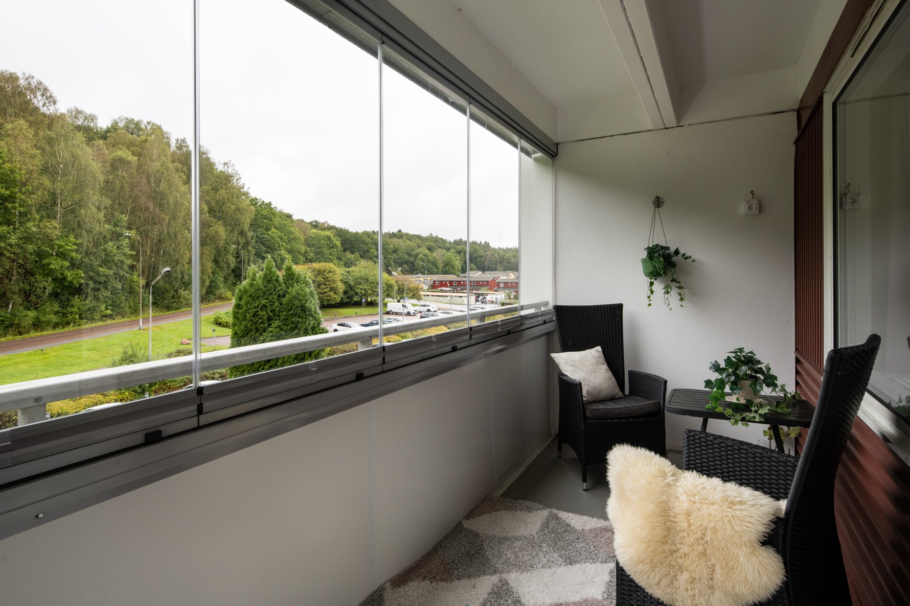 Det generösa allrummet erbjuder gott om utrymme för både soffgrupp, sovdel och ytterligare förvaringsmöbler. Ett stort fönsterparti släpper in rikligt med ljus och skapar en ljus och luftig känsla. Från rummet nås den inglasade balkongen – en perfekt plats för avkoppling oavsett säsong. Glaspartierna kan vikas undan helt för att öppna upp och bjuda in utomhuskänslan.