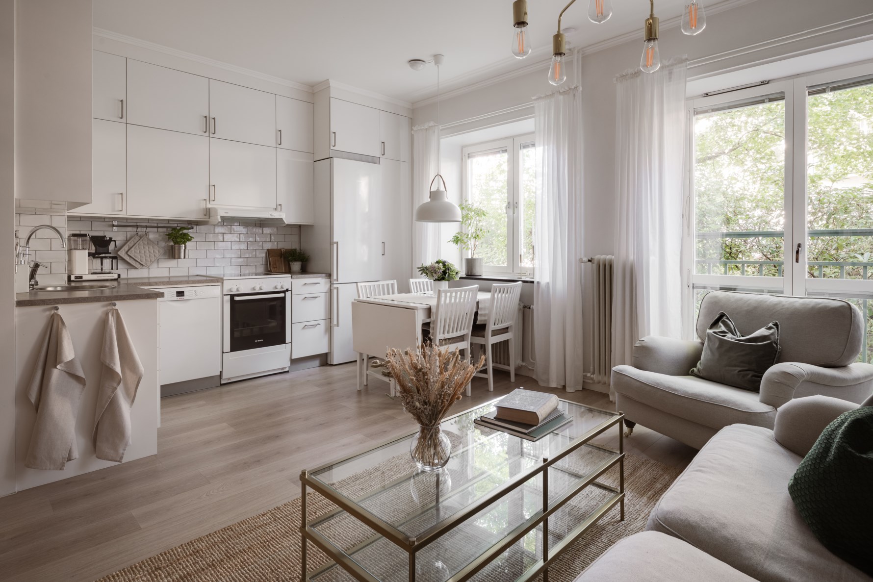 Trivsamma sociala ytor med kök och vardagsrum i öppen planlösning. Här kan man inreda med soffhörna och matsalsbord. Rummet har fint ljusinsläpp från flera fönster samt en fransk balkong och rogivande grönska utanför. De vitmålade väggarna bryts av med en fondvägg i dekortegel som ger en rustik känsla.