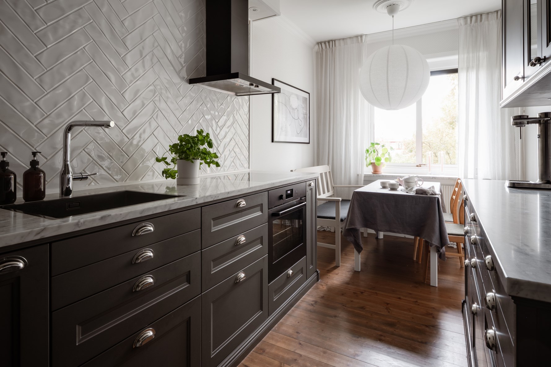 Bostadens kök totalrenoverades 2020 och köksinredningen är inbyggd med lister av en finsnickare för en snygg finish. Köksinredningens gråa ramluckor med beslag i krom kombineras med bänkytor i ljus marmor och vitt kakel i fiskbenssättning. Den maskinella utrustningen utgörs av induktionshäll, kolfilterfläkt, inbyggd varmluftsugn, mikro, integrerad diskmaskin, integrerad kyl med frys samt en vinkyl. Samtliga vitvaror är från Ikea förutom vinkylen som är från Caso och mikron från Samsung. Golvet kläs av plankgolv som är hårdvaxat och betsat med valnötsfärg och väggarna är tapetserade i en vit diskret mönstrad tapet från Boråstapeter. Invid fönstret finns en given plats för ett mindre matbord för två personer.