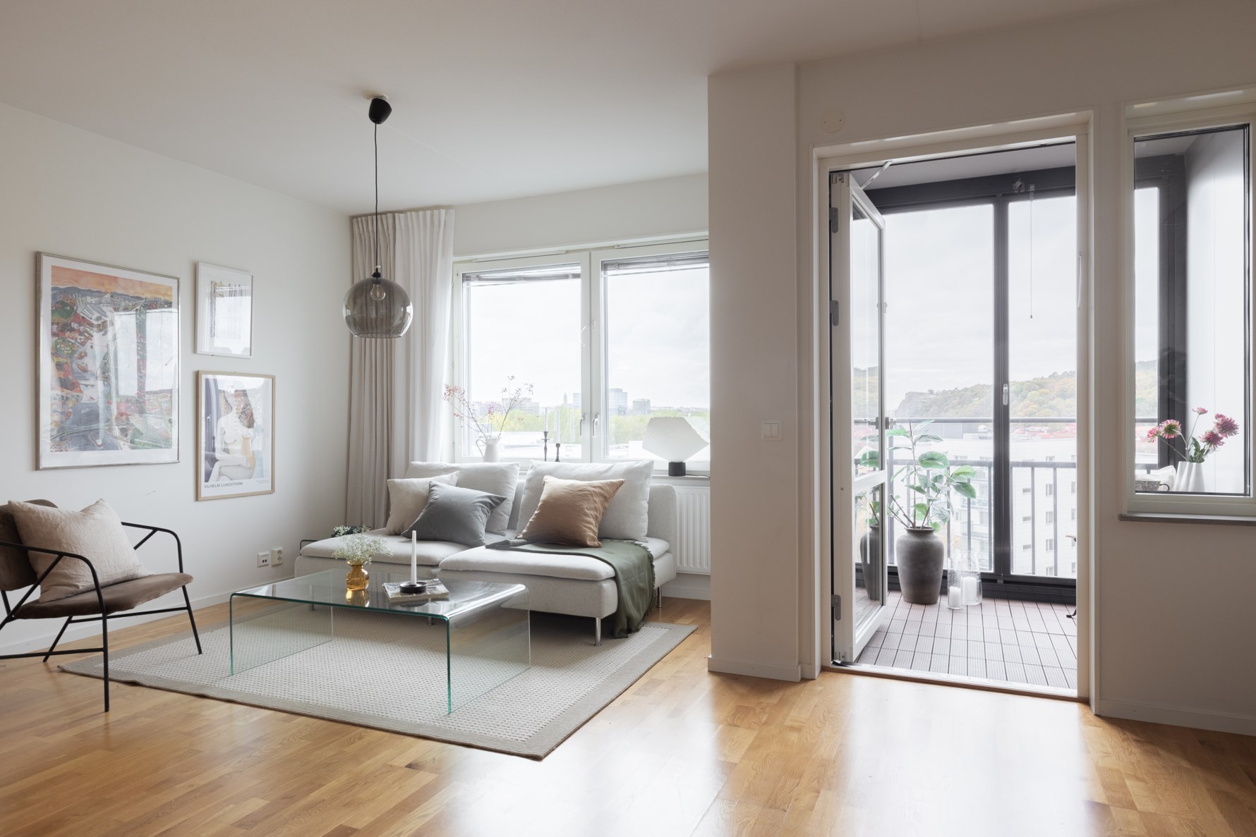 Innanför ytterdörren möts man direkt av det härliga ljuset som är i bostaden. Hallen erbjuder goda förvaringsmöjligheter i en generös skjutdörrsgarderob. Lägenheten har genomgående ekparkett och vitmålade väggar.