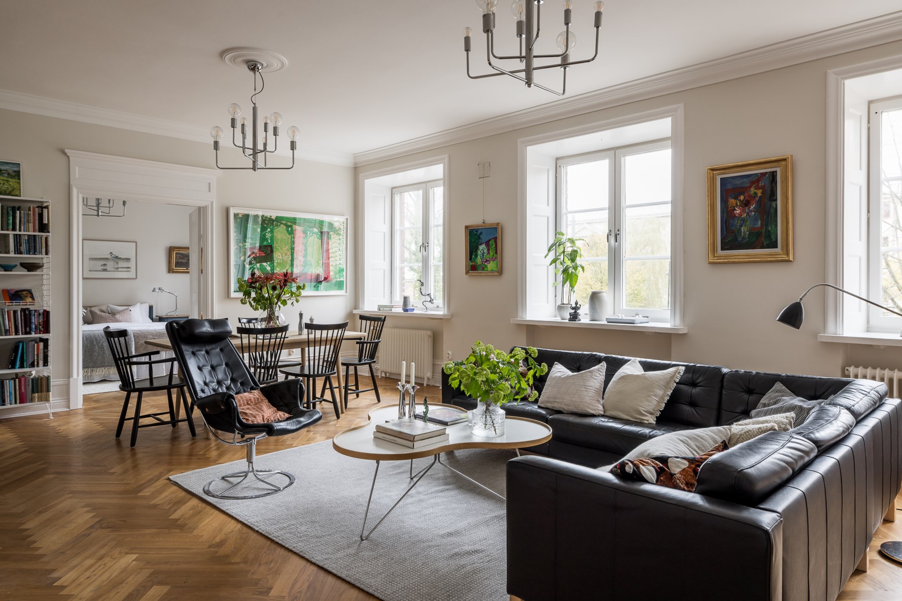 Tre rum som ligger i fil, inramade av höga profilerade fotlister och tidstrogna dörrfoder. Pardörrar med speglar och eleganta överstycken förstärker den klassiska karaktären. Takhöjden på närmare tre meter, tillsammans med dekorativ stuckatur och stilren takrosett ger en känsla av rymd och elegans.