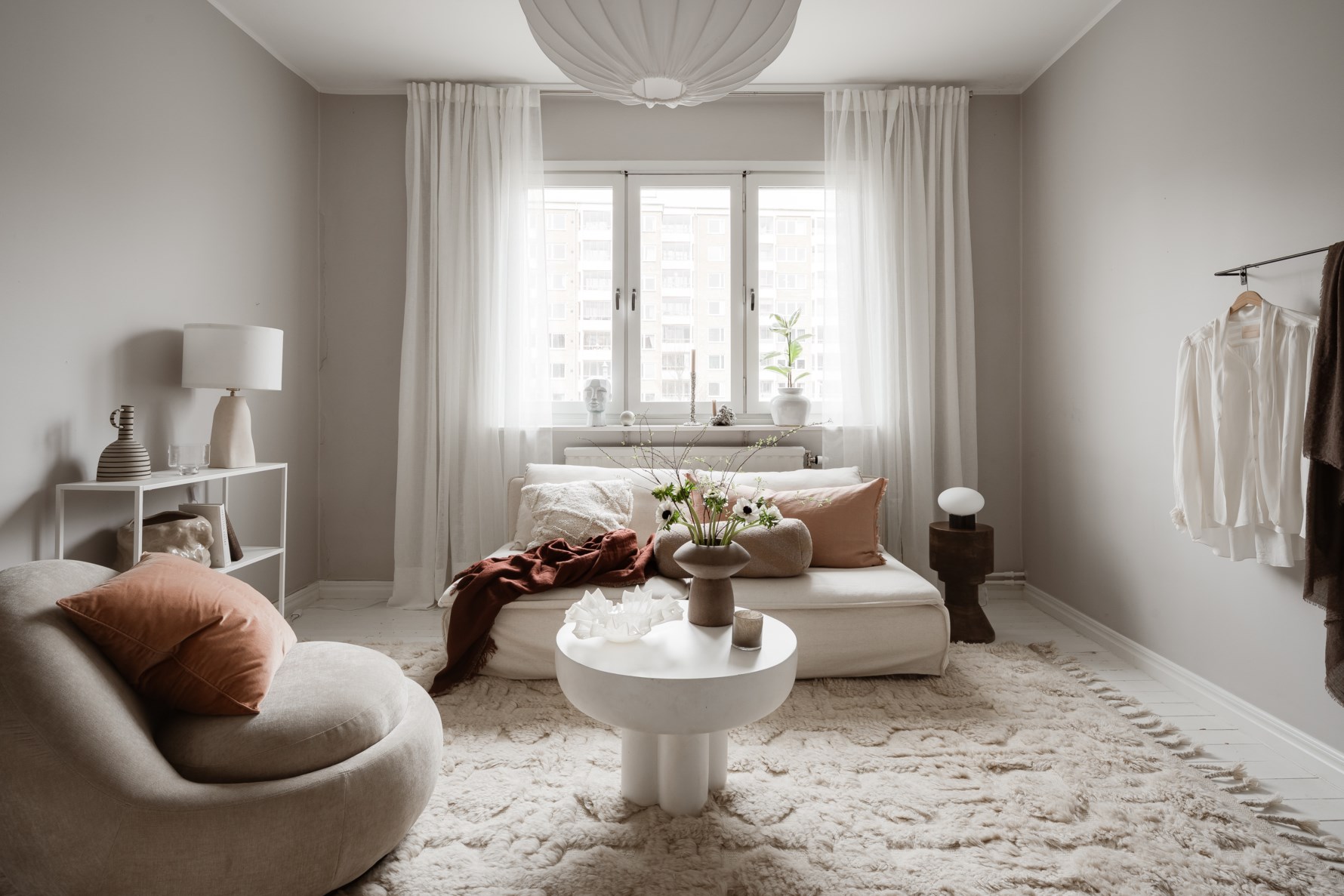 Rymligt allrum med gott om plats för en större säng men utan att behöva tumma på övrigt möblemang. Här ryms med lätthet en soffgrupp, skrivbord eller matbord och tv-bänk. Tidsenligt och charmigt plankgolv och väggarna är målade i en ljus kulör. Stora fönster och högt i tak bidrar till luftig och rymlig känsla.