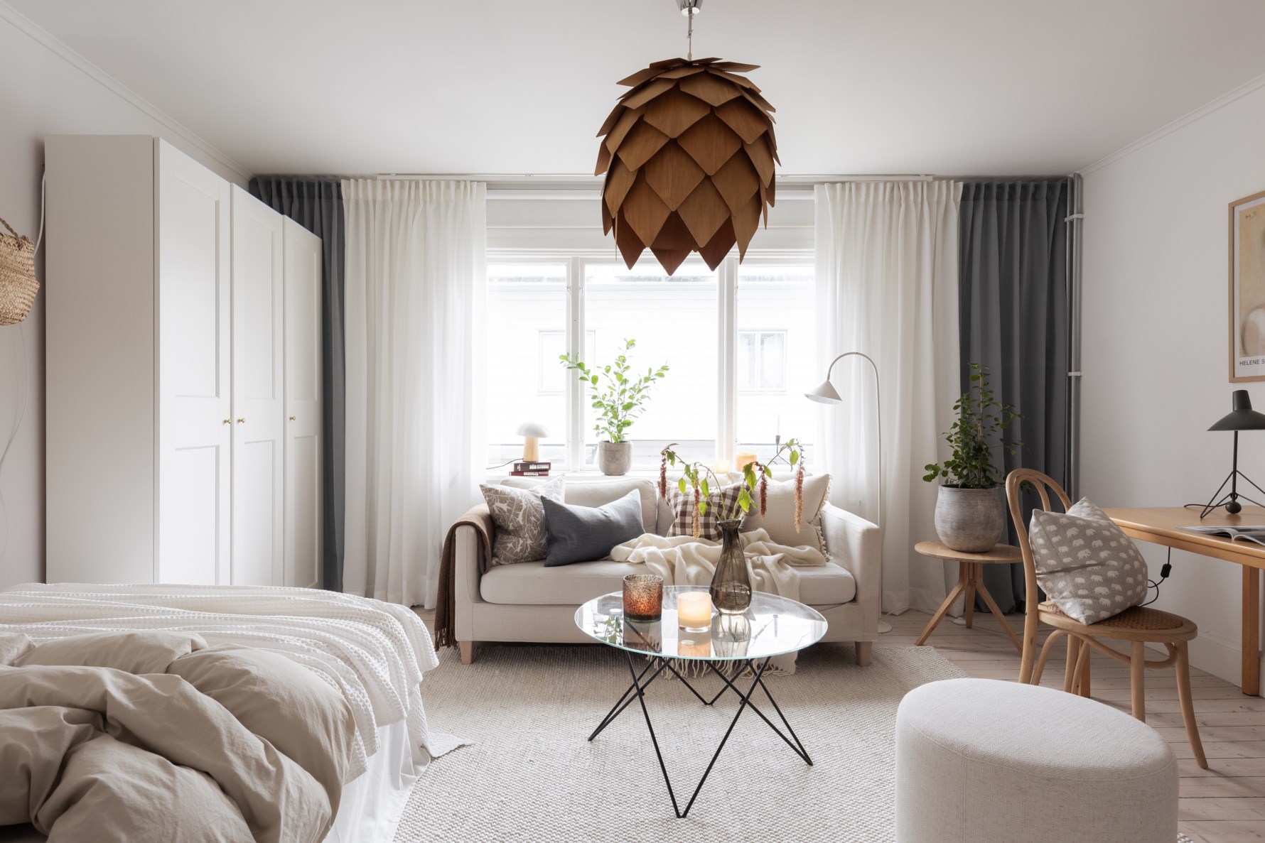 Ljust och lättmöblerat allrum med plats för såväl sällskapsdel som sovdel. Förvaringsmöjligheter i tre garderober. Ett stort fönsterparti släpper in rikligt med ljus vilket skapar en härlig atmosfär. Som pricken över i:et finns även en vacker välbevarad kakelugn.
