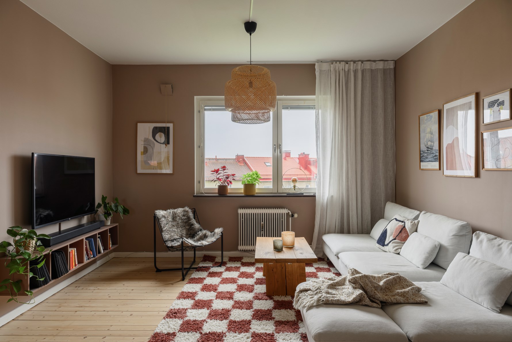 I vardagsrummet fortsätter de fina brädgolven som slipades och lackades 2024. Rummet är stort och lättmöblerat med plats för både soffgrupp, tv-bänk och matplats. Väggarna målades i en varm ljusbrun ton 2025, vilket ger en ombonad och elegant känsla tillsammans med det generösa ljusinsläppet från fönstren.