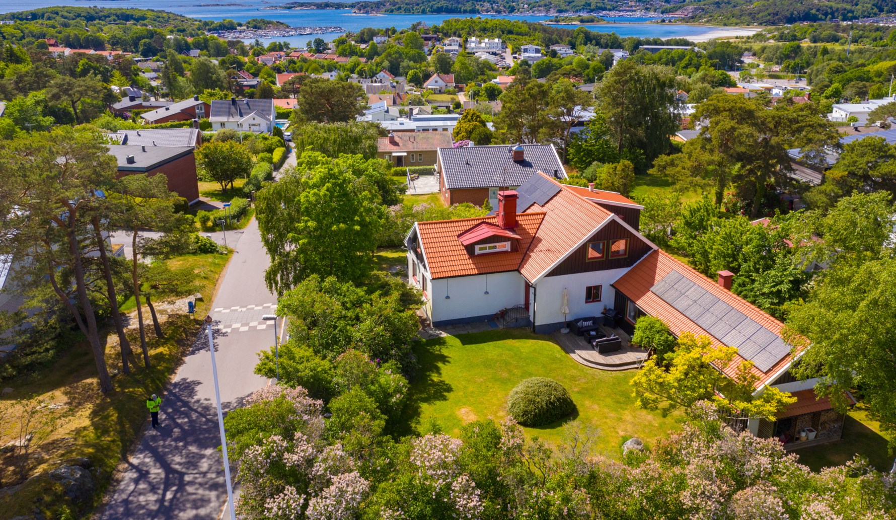 Husets tre sovrum ligger avskilt belägna på övre plan i anslutning till ett allrum och ett stort badrum. Det första man slås av är allrummets hänförande utsikt över trädtoppar, hustak och det glittrande havet. Rummet kan inredas med valfritt möblemang och kan även göras om till sovrum om man önskar.