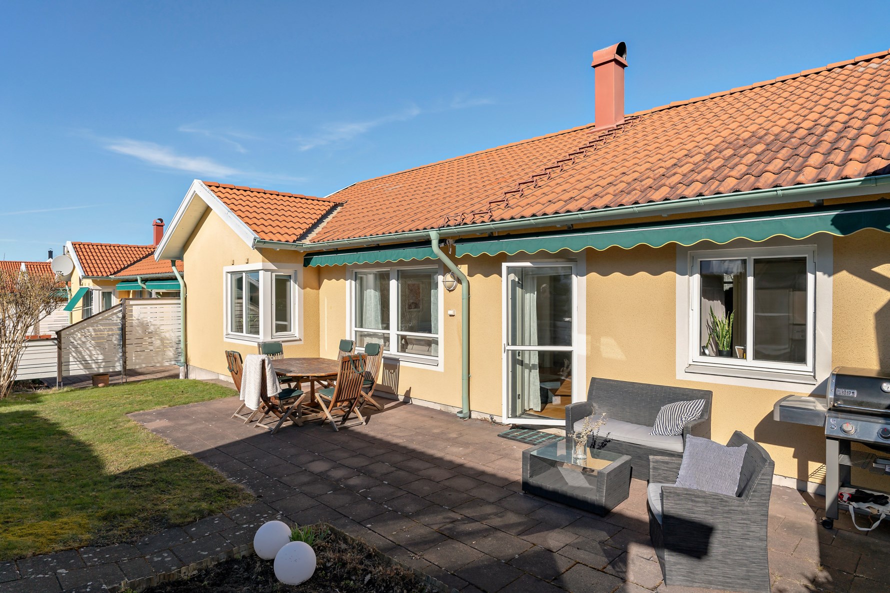 Tomt: Tomtarea 320 kvm. Insynsskyddad med granhäck och målat staket. Soligt sydväst läge.