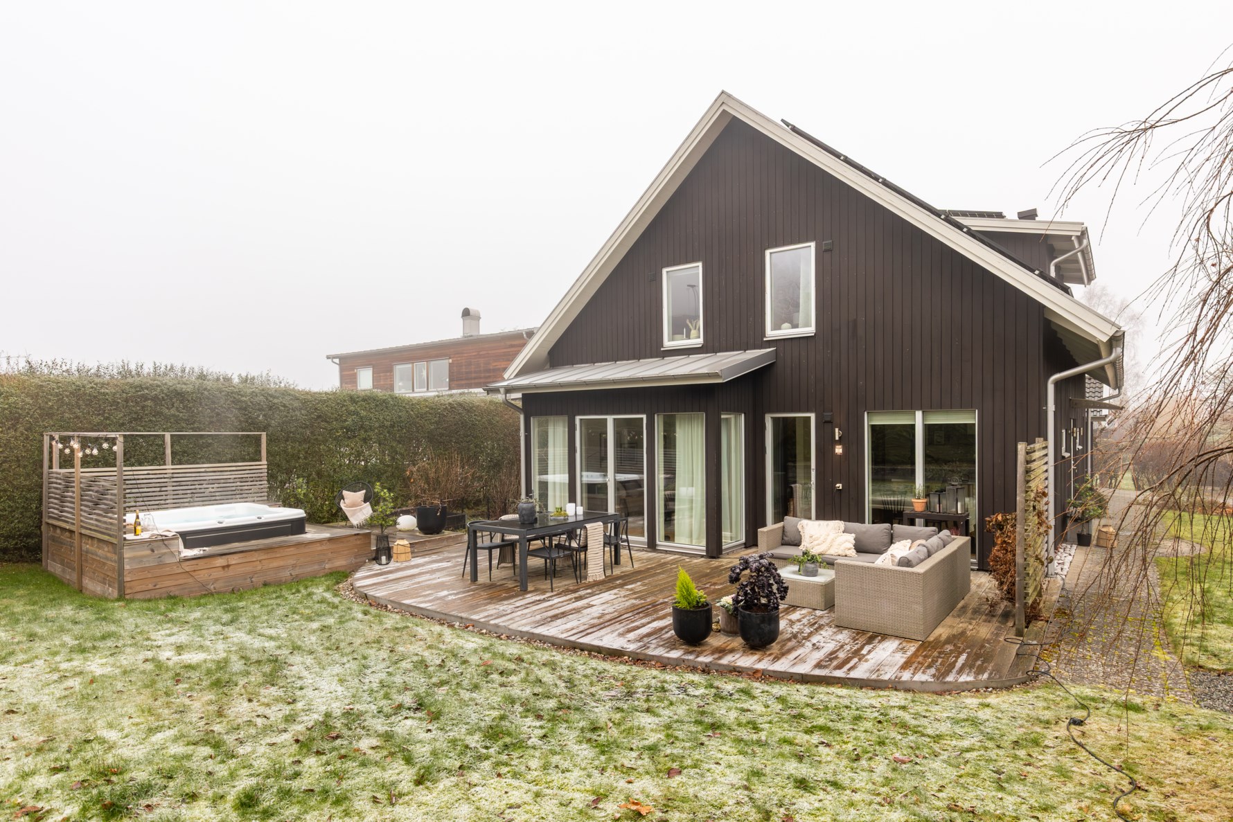 Huset har solpaneler på taket och laddare till elbil monterat. På tomten finns ett nyare spabad.